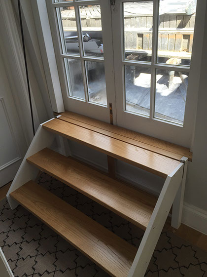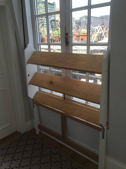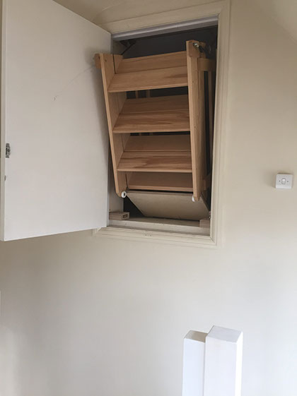 This client had the problem of needing to access a storage area that was 4 foot above an existing stairwell, with access proving to be highly dangerous and difficult. A suggestion had been made for a complex steel construction requiring 2 men to assemble and costing rather a lot of money. This would mean that the area would end up not being used at all. Our push button solution utilising a specially designed smaller version of our Petworth ladder means that the space can be used at all times and access is safe and easy.