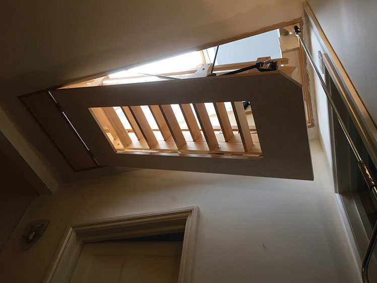 This ladder was a real challenge, as we had a very small loft opening and limited storage space in the eaves in which to store the ladder. This required some clever re-engineering of our patented design to achieve a solution which works efficiently and will serve the client reliably for many years to come.